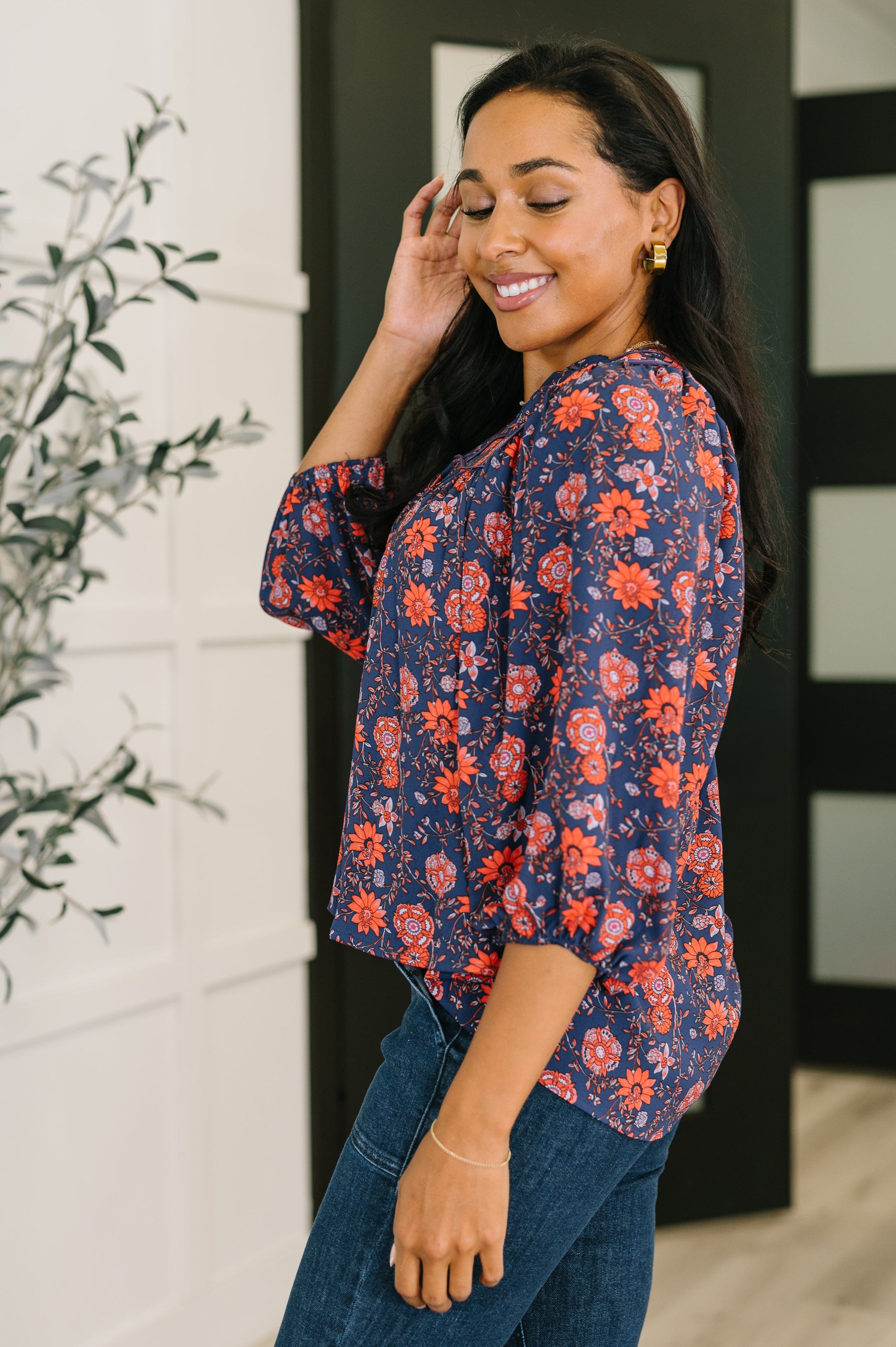 Fall in love with the Drifting Blossoms Cold Shoulder Top! Featuring a denim blue floral...